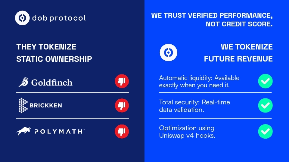 DOB Mitigation: Liquidity is engineered through programmatic mechanisms and Uniswap v4 Hooks backed by revenue flows. DEX provides built-in liquidity for all listed RWA tokens.
